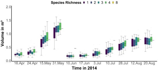 Temporal distribution of total volume per time slice throughout the growing season in 2014. The total volume calculated based on voxelization technique is displayed across the experimental species richness gradient in colored code. Note that the eight-species communities represent two communities in our database, therefore the mean lines have lower variance than other communities and the interquartile ranges in the boxplot are not shown.