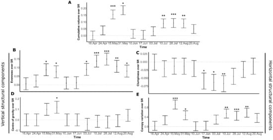 Coefficient plot showing the variation of estimates (effect sizes) of species richness (SR), its contrast to zero with 95% confidence intervals. (A) shows the slope each of the cumulative volume and (B) for evenness, (C) for Clumpiness, (D) for center of gravity, and (E) for canopy variation. The slopes are based on mixed-effects models during the growing season in 2014 with codes for significant relationships: 0 ‘***’ 0.001 ‘**’ 0.01 ‘*’ 0.05 ‘.’.