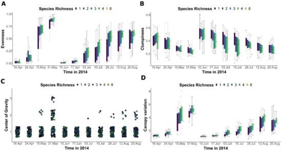 Temporal distribution of four community canopy structural components throughout the growing season: (A) evenness (calculated as the sum of volume proportions of each of the five strata per total volume of the plot divided by 5); (B) clumpiness (calculated via Geary’s (C) index that measures the spatial distribution of clusters in the rasterized 3D point cloud for each plot where values close to zero indicates less clumpiness (similar clusters) while values close to 1 display high clumpiness (dissimilar clusters)); (C) center of gravity (displayed as a categorical measure of the strata of height with the highest volume proportion to the total volume per 5 strata); (D) canopy variation (calculated as the area of fitted surface mesh on the canopy divided by plot area). See details in Section 2.2.1.