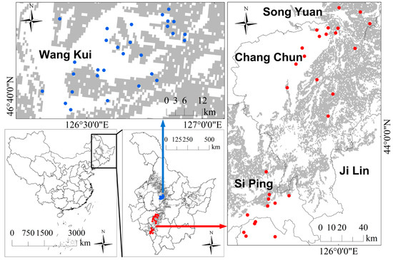 The geographic extent of the sampling sites: dark background indicates the typical black soil area in northeast China. Blue and red points indicate sampling points in Heilongjiang and Jilin.