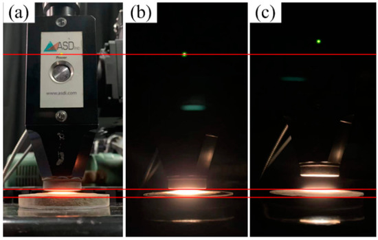 (a) Probe setup with 0.3 cm gap in illuminated room condition; (b) probe setup with 0.3 cm gap in darkroom condition; (c) probe setup with 1 cm gap in darkroom condition; three red lines of reference indicate the position change of the probe.