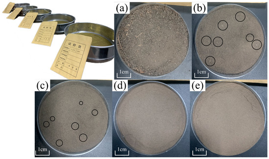 Standard diameter metal mesh soil sieves and sieved samples: (a) 1 mm sieved sample; (b) 0.5 mm sieved sample; (c) 0.25 mm sieved sample; (d) 0.1 mm sieved sample; and (e) 0.075 mm sieved sample.