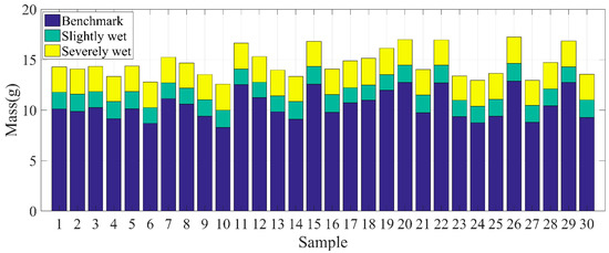 We illustrated the mass change of all humidified JL samples to demonstrate their moisture change instead of calculating the water contents because the humidifying method in our experiment cannot always completely and evenly humidify the soil samples in a relatively short time. Therefore, using the calculated water content to represent the soil moisture change would not yield accurate results. As shown in Figure 10, the benchmark samples obtained an average mass gain of 1.644 g after 5 min of humidification, which was regarded as a slightly wet condition. Furthermore, soil samples had an average mass gain of 2.546 g after another 25 min of humidification, which was regarded as a severely wet condition.