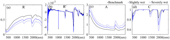 The average spectral reflectance and corresponding three forms of spectral transformations of JL samples in different soil moisture control experiments are presented in Figure 11a–d (the corresponding results of all samples are shown in Supplementary Figures S11–S14). Figure 11a and Figure S11 show a common decrease in spectral reflectance with increasing moisture content [21,22,48]. In contrast, the spectral absorbance showed a tendency to increase with the soil moisture increase (Figure 11c and Figure S11). Moreover, it can be seen that the water absorption range in the SWIR domain was enhanced with the increase in soil moisture in the results of R, A and C spectra (Figure 11a,c,d, Figures S11, S13 and S14) [49,50,51]. The variations were not distinguished in R’ spectra.