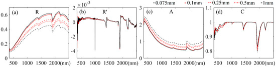 The average spectral reflectance and corresponding three forms of spectral transformation of the JL samples in different light interference control experiments are presented in Figure 8a–d (the corresponding results of all samples are shown in Supplementary Figures S1–S4). It is seen in Figure 8a that from the benchmark to the darkroom 1 cm gap condition, the spectral reflectances had similar spectral shapes yet showed a generally reduced whole VNIR-SWIR spectral region. Benchmark spectra were apparently higher than other three treatments, no matter whether just considering the average or all cases. Figure 8c illustrates that the variation tendency of spectral absorbance was almost symmetric about the x-axis with the corresponding spectral reflectance. The spectral variations were not noticeably different in R’ and C spectral forms, yet it was easily distinguished in Figure 8a,c,d that the spectral discontinuity at the 1000 nm internal detector splice [9] was obviously magnified in light-intervening conditions.