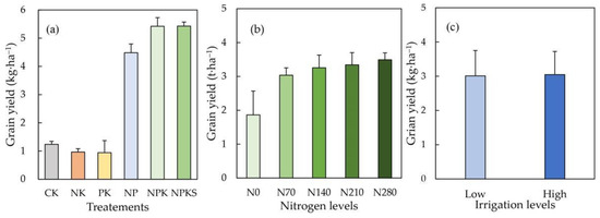 The observed grain yield at varying nutrient treatments: (a) NBES plots, WNCR plots across various (b) nitrogen and (c) irrigation levels.