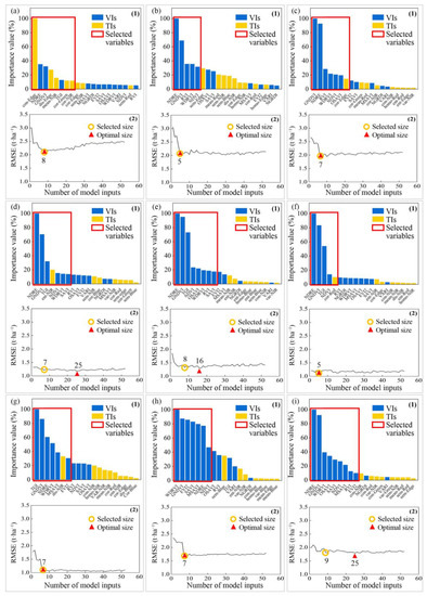 (1) Importance values of the top 20 ranked variables for the yield prediction model and (2) RMSE variation (t·ha−1) as the size of inputs increases when using each of the nine mono-temporal UAV data: (a) second-leaf, (b) fourth-leaf, (c) sixth-leaf, (d) fourteenth-leaf, (e) tasseling, (f) silking, (g) milking, (h) dough stage, and (i) maturity. The importance values were normalized by the value of the first ranked variable for each stage [58]. TIs of the images calculated using blue, green, red, red edge, and NIR bands are denoted as TI-Blue, TI-Green, TI-Red, TI-Edge, and TI-NIR, respectively. con = contrast, dis = dissimilarity, cor = correlation, sem = second moment, ent = entropy, homo = homogeneity, var = variance.