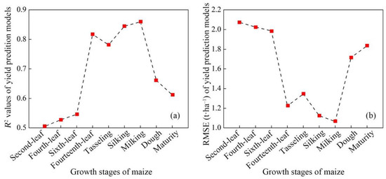 The R2 values of yield prediction using mono-temporal UAV data ranged from 0.51 (second-leaf) to 0.86 (milking), and the RMSE values ranged from 2.07 t·ha−1 (second-leaf) to 1.06 t·ha−1 (milking), suggesting the early grain filling is the best phenological stage for yield prediction under the condition of mono-temporal UAV observation (Figure 5). Comparing distinct maize growth stages, yield prediction accuracy followed the order of milking > silking > fourteenth-leaf > tasseling > dough > maturity > six-leaf > fourth-leaf > second-leaf stages (Figure 5). In addition, it should be noted that the prediction accuracies of the four stages including the fourteenth-leaf, tasseling, silking, and milking stages (R2 = 0.78–0.86, RMSE = 1.35–1.06 t·ha−1) were significantly higher than those of the other five stages (R2 = 0.51–0.66, RMSE = 2.07–1.71 t·ha−1) (Figure 5), indicating the period around flowering is the most critical period for the prediction of maize yield.