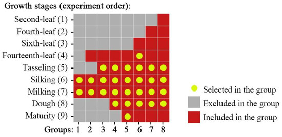 It should be noted that screening in Section 3.2.2 removed UAV variables that were not effective in improving the accuracies of yield prediction models. The UAV data actually used for yield prediction in each group were shown in Figure 6 (the yellow dots); it showed that UAV variables at the second-leaf, fourth-leaf, and sixth-leaf stages were all removed in all groups, indicating that the observations at these three stages were not effective in improving maize yield prediction accuracy.