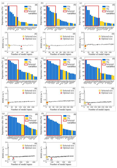 As shown in Figure 7, for the first, second, sixth, seventh, and eighth groups of UAV datasets, the lowest RMSE values were 0.93, 0.92, 0.72, 0.80, and 0.78 t·ha−1, respectively, with corresponding inputs sizes of 56, 19, 54, 87, and 89, respectively (optimal size). Following the rules of Section 2.4.1, the selected input sizes for these four groups were 6, 6, 11, 11, and 10, respectively, as their RMSE values (i.e., 0.95, 0.93, 0.76, 0.81, and 0.81 t·ha−1, respectively) were comparable to the lowest RMSE values. Therefore, the appropriate feature sizes for the eight multi-temporal datasets were determined to be 6, 6, 9, 7, 9, 11, 11, and 10, respectively.
