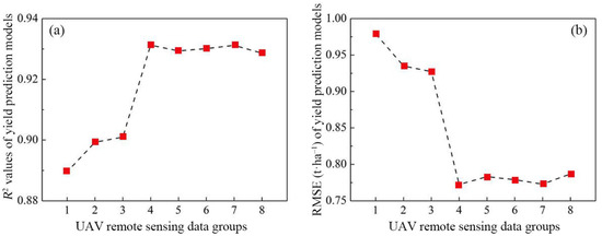 As displayed in Figure 8, the R2 values of yield prediction using multi-temporal UAV data ranged between 0.89 and 0.93, plus the RMSE values ranged from 0.97 t·ha−1 to 0.77 t·ha−1. From the first to the fourth group, the performance of the prediction model gradually improved. As the number of the used mono-temporal data increases, R2 increases from 0.89 to 0.93, and RMSE decreases from 0.98 t·ha−1 to 0.77 t·ha−1. The best yield prediction was achieved through the fourth group of multi-temporal UAV data which contained the tasseling, silking, milking, and dough stages. We would like to highlight that the UAV data at the tasseling, silking, milking, dough stages were included in the group four to eight (Figure 6), and no obvious improvement was observed from the fourth to eighth groups (Figure 8). These results demonstrated that the combination of tasseling, silking, milking, and dough stages played vital roles in ensuring yield prediction accuracy.