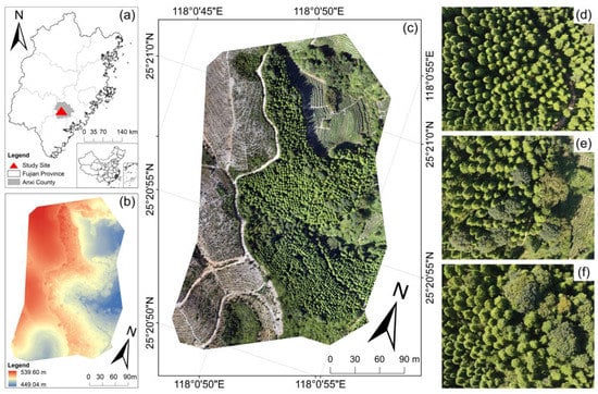 Location of the study site, Anxi County, Fujian, China. (a) study site in Anxi County, Fujian. (b) the digital surface model (DSM) derived from UAV. (c) UAV image. (d–f) are detailed examples of Fokienia hodginsii with other tree species.