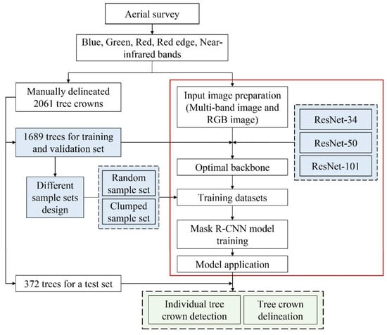 Figure 2 presents a framework of the proposed experimental design. First, different backbones coupled with a training and validation set (1689) were used for the Mask R-CNN model training to evaluate the accuracy of individual tree crown detection and delineation. The aim was to select the appropriate backbone for Mask R-CNN to detect Fokienia hodginsii. Second, to evaluate the sample size and sample labeling for the model performance, 1689 manually delineated tree crowns were deleted at a rate of 10% percentage by random and in a clumped manner, respectively. Moreover, the RGB image and the Multi-band image were selected as the input image to evaluate the influence of the input image on the model performance. Third, to evaluate the model training efficiency, the average pre-epoch training time of each model was compared. A total of 42 models were designed and tested in this study. The variable parameters are as follows in the following sections.
