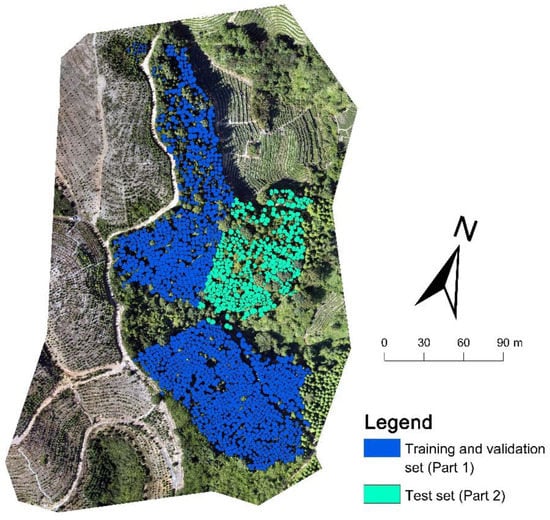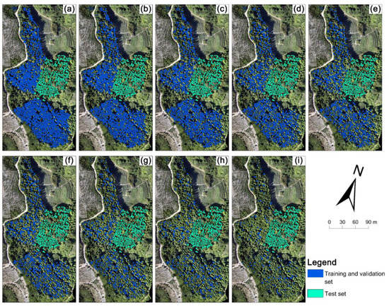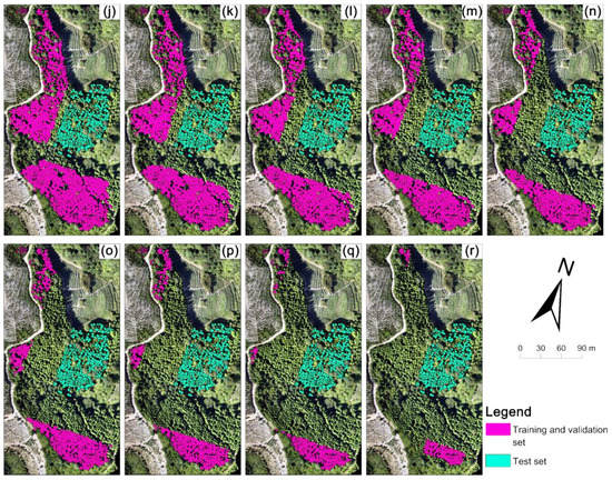 The Fokienia hodginsii trees from the study site were divided into two parts (Figure 3). A total of 1689 manually delineated trees in part 1 were used for model training, and 372 manually delineated trees in part 2 were used as test data. First, 1689 individual tree crowns were used as a training and validation set to choose the optimal backbone between ResNet-34, ResNet-50, and ResNet-101. Subsequently, the training and validation set (1689) was repeatedly reduced by 10%, that is, 1520 (90%), 1351 (80%), 1182 (70%), 1013 (60%), 844 (50%), 675 (40%), 506 (30%), 337 (20%), and 168 (10%) of the training and validation sets for model training, to evaluate the influence of sample size on model performance. Here, two methods for reducing the training and validation set were used: random deleting and clumped deleting, in order to simulate the label accuracy and labeling pattern during the delineated tree-crown acquisition in the sample preparation of the Mask R-CNN model to evaluate the influence of sample labeling on model performance. The training and validation set obtained by random deleting and clumped deleting are subsequently referred to as the random sample set and clumped sample set. The random sample set aims to imitate the situation of labeled samples that were widely distributed, but where not all the samples were labeled. The random sample sets were collected by randomly deleting 10% (169 trees) from the training and validation set (initially 1689), and then repeatedly deleting 169 samples from the former random sample set. A total of 9 random sample sets were developed for this study (Figure 4a–i). The clumped sample set imitates the case when the labeled samples are concentrated in some region of the image, and each tree is labeled. The clumped sample sets were deleted according to the distance from the test set in the image. The trees close to the test set were deleted first, and then 169 trees were deleted repeatedly (Figure 4j–r). A total of 9 clumped sample sets were developed. Overall, a total of 19 groups of training samples were created, and the distribution and location of the training samples are shown in Figure 3 and Figure 4.
