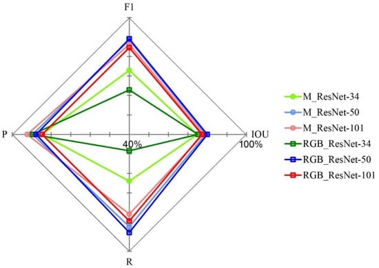 The detection accuracy of Fokienia hodginsii using Mask R-CNN with three different backbones (ResNet-34, ResNet-50, and ResNet-101). The same number of training samples (1689 tree crowns) and two input images (RGB image and Multi-band image) were used as input into the model, and other parameters were kept the same. The accuracy was achieved using ResNet-34 with the Multi-band image, which is highlighted in light green, ResNet-34 with the RGB image is in dark green, ResNet-50 with the Multi-band image is in light blue, ResNet-50 with the RGB image is in dark blue, ResNet-101 with the Multi-band image is in light red, and ResNet-101 with the RGB image is in dark red. R, P, F1, and IoU represent recall, precision, F1 score, and Intersection over Union, respectively.