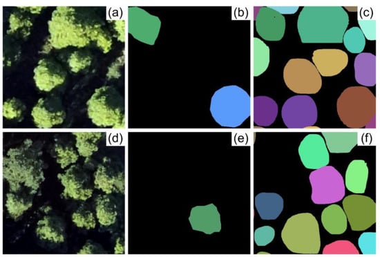 Example of the detected results of Mask R-CNN with a combination of Multi-band image and a random sample set (using 337 manually delineated tree crowns). (a,d) are input images; (b,e) are the labels by random sampling; (c,f) are predicted results. Different colors represent the different trees.