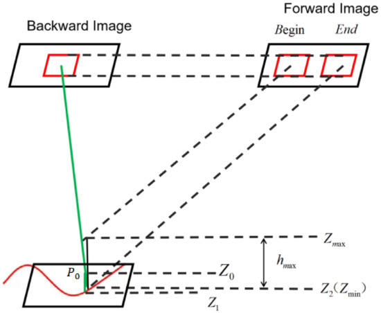 The principle of parallex search range is illustrated in Figure 2. The input building roof contour is on the 2D backward image, and the DSM is in the 3D object space. An iteration algorithm is used to obtain building roof elevation from the DSM data, in which it starts from an initial elevation , such as the mean elevation of the study area. Then, the algorithm executes iteratively as follows: