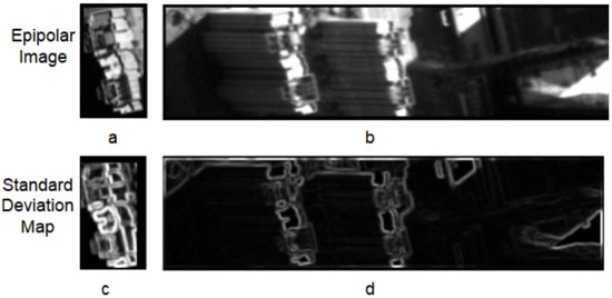 Figure 5 illustrates the epipolar image blocks and their corresponding standard deviation maps. Figure 5a is the backward image block of a building; Figure 5b is the forward image block to be matched. Due to the imaging view difference, these two image blocks have dramatic bright difference. Figure 5c,d respectively shows the standard deviation map of Figure 5a,b, whose bright difference is greatly reduced.