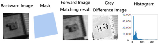 Based on the standard deviation maps, we use the gray difference to measure the similarity between the backward image and the forward image. The gray difference similarity is measured as the absolute gray difference between the template and the searched image, as shown in Equation (2), where is the searched pixel value with x parallax p; w, h is the template window size; is the pixel value of the template window, respectively. The parallax p with the smallest gray difference sum is regarded as the matched result.