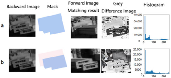 Fortunately, the gray difference map of the matched blocks can provide more clues to refine the initial matching result. The gray difference map data represents the average brightness difference of backward and forward parallax. As shown in Figure 6, the gray difference histogram distribution should be in the range of (0–100) values if the matching result is completely correct. However, there are two peaks in the histogram as shown in Figure 8a, one is in the range of (0–100), and the other is in the range of (200–250). This indicates that there are two different heights in the building, and only one height is matched correctly. To solve this problem, we match the different height of a building with podium using the masked gray difference in an iterative manner. As shown in Figure 8a,b, by using two different masks, the bottom height of the podium is estimated in the first pass, and the top height of the podium is estimated in the second pass.