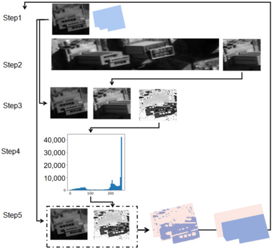 In order to exclude the interruption of pixels outside the building roof contours, the gray difference is modified to be a masked gray difference, as shown in Equation (3), in which only the roof pixels are taken into account.