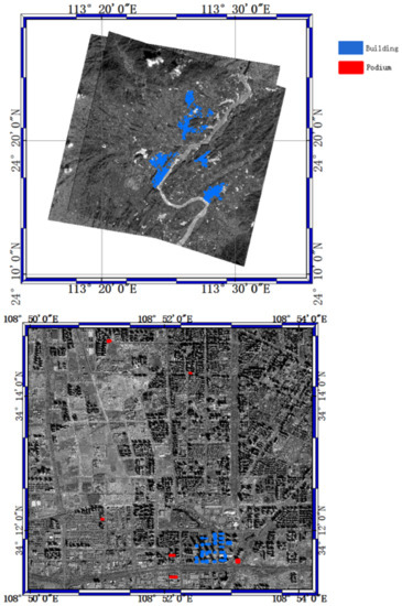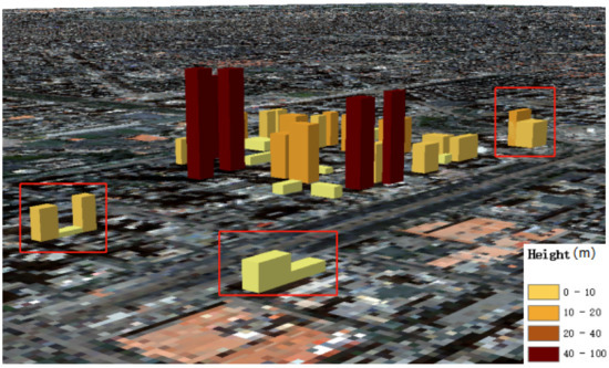 The ground truth of building height was calculated according to the roof elevation and bottom elevation. As mentioned ahead, the roof elevation and bottom elevation in the Yingde study area were estimated with LiDAR data. In the Xi’an study area, the roof elevation and bottom elevation were measured in a self-developed stereo model viewer software.
