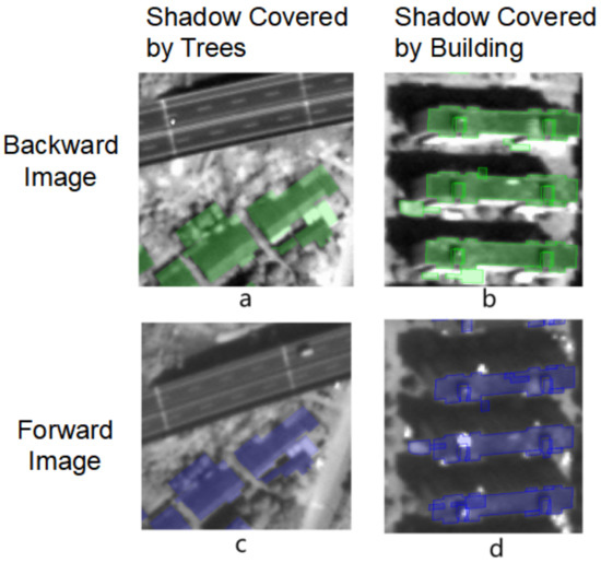 The illustration of shadow occlusions. (a,c) building shadows occluded by trees; (b,d) building shadows occluded by buildings.