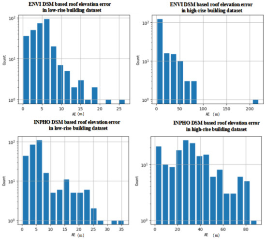In this section we compare the proposed solution with DSM Based Method. We used ENVI (version 5.6) and INPHO (version 12.1) to generate DSM in Yingde. After generating the DSM, we overlaped the building contour vector onto the DSM for building height extraction. The roof elevation and the bottom elevation are estimated with histogram analysis, which has been discussed in the Section 2.3. The peaks of maximum elevation and minimum elevation are selected as of the building roof and the bottom. Shown in Figure 16, DSM generated by INPHO is relatively smooth, however, it loses some high-rise heights. On the contrary, the DSM generated by ENVI can retain high-rise buildings better, however, it can contain some holes.