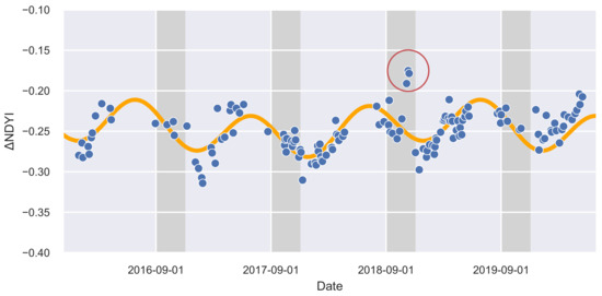 Substantial annual variation was present in the TOA reflectance observations over forest due to climatic conditions, vegetation phenology (e.g., new leaves), and sun angle. The NDYI signal visually observed during flowering was subtle enough within the context of a year of data that setting simple thresholds was inadequate to produce a reliable result. Additionally, flowering can occur at different times during the spring season, depending on latitude and altitude [3,8]. The temporal sequence of NDYI for a pixel in the Hawdon Valley (South Island, New Zealand) is shown in Figure 2 as an example. The orange line is a modeled NDYI time series that is unique to that pixel, using an approach similar to that used in the TMASK methodology developed for cloud detection in Landsat 8 imagery [35]. The model used robust regression to calculate unique per pixel () coefficients for the sine and cosine terms for intra- (, ) and inter-annual (, ) variability, as well as a constant term (). Where x is the number of days since the start of the temporal sequence, is the number of days per year, and is the number of days in the sequence: