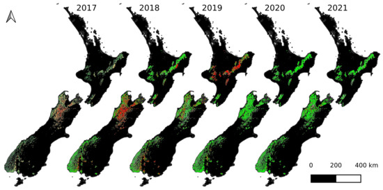 Figure 4 shows the maps of heavy beech flowering as detected by our method for years 2017–2021. In spring 2018, a lot of heavy beech flowering was detected in the north-west of the South Island, which was synonymous with a “mega-mast” event in that region. In the North Island and the south-west of the South Island, some pockets of heavy flowering were detected. The following year, in spring 2019, the flowering was much reduced in the north-west of the South Island, but in the North Island, a lot of heavy flowering was detected, which was synonymous with another “mega-mast”. The south-west of the South Island had pockets of heavy flowering, much the same as in 2018. In years 2020 and 2021, minimal beech flowering was detected in most areas.