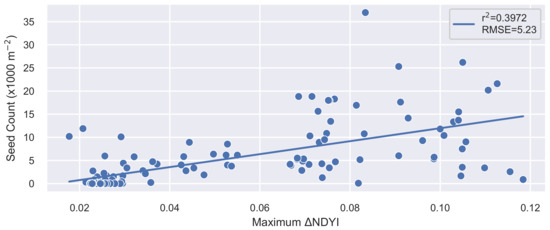 Not all heavy beech flowering in spring results in heavy seed fall in the following autumn. Heavy frost or very wet weather can interfere with seed production [3]. Figure 5 shows how well the maximum compared to seed counts in trays located on the floor of the beech forest (seed traps are spread throughout beech forests in New Zealand as part of a long-running monitoring program conducted by DOC [4]). Data were restricted to locations with at least eight valid observations in order to obtain representation over the majority of the spring season. There was noise in the data, nevertheless high seed counts generally corresponded with high maximum ( = 0.397). For reference, the model had values between 0.331 and 0.556 for the same species range [7] (although that study used the older genus name Nothofagus). Reasons for the mismatches between the and seed count include: cloud coverage still obscuring the flowering event, despite the high number of revisits (low vs. high seed count); inaccurate trap location (variable impact on relationship); trap location relative to flowering trees combined with wind direction during seed fall (high vs. low seed count); different beech species (different relationship between and seed count); climate, adverse weather events, and nutrient availability (lower seed count vs. higher ); and inaccuracies in the method (addressed in accuracy assessment). We recommend that the national map of flowering/not flowering be regarded as a map of potential high seed fall for initial planning purposes, which is to be confirmed later with additional information, such as selected field observations.
