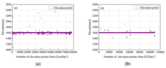 (a) All elevation points of Cryosat-2 and (b) ICESat-2 passing through Lake Issyk-Kul.