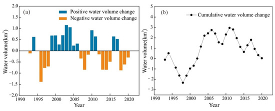 (a) Annual variations in water volume and (b) cumulative change in the water volume of Lake Issyk-Kul from 1990 to 2020.