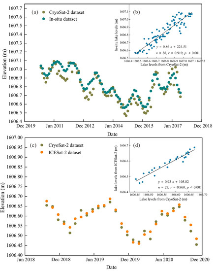 In this section, we first evaluate the accuracy of the lake level data derived from CryoSat-2, and then the accuracy of the water area data extracted from the JRC dataset is explored systematically.