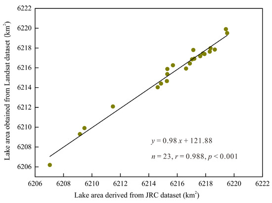 The comparison between the extraction results of the JRC dataset and the Landsat dataset using the mNDWI and OTSU algorithm is shown in Figure 10. The RMSE of the lake area derived from the JRC dataset was 0.518 km2 with a CC of 0.990 and an MAE of 0.470 km2, further demonstrating the feasibility of obtaining long-term area data of Lake Issyk-Kul from the JRC dataset.