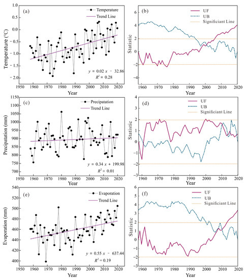 Inter-annual variations in (a) the annual mean temperature, (c) the annual total precipitation, and (e) the annual total evaporation of the Issyk-Kul Lake Basin, and (b) the M–K tests of (b) temperature, (d) precipitation, and (f) evaporation.