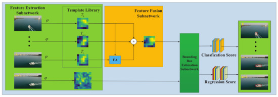 Schematic of the TDSiam framework. On the left is the feature extraction subnetwork. The feature fusion subnetwork is depicted in the middle, which is responsible for fusing the information from the template library. On the right is the bounding box estimation subnetwork, which has two branches, one is in charge of foregroundβbackground classification, and the other is used for bounding box regression.