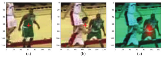 Figure 3a,b present the templates cropped from the predicted results during the tracking process. The red cross indicates the center of the image, but they belong to different targets. If we fuse them according to their linear weights, interference will be introduced into the template. Fortunately, we notice that features with the same appearance have high cosine similarity, as seen in Figure 3c, where the red region indicates a high value. Thus, we have proposed an FA module to reconstruct the misaligned template features based on their cosine similarity.