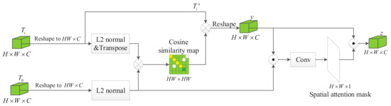 The goal of the FA module is to ensure that the same spatial position on the reconstructed feature map belongs to the same part by reconstructing each misaligned feature map. It can be considered as a matching task between two feature maps. The detailed construction of the FA module is shown in Figure 4. The and indicate the feature map extracted from the initial ground-truth and the predicted results, respectively, both their dimensions are . The cosine similarity (CS) between each position of and can be calculated as follows: