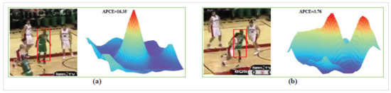 Visualization of the response map. (a) When the target is not occluded, the response map has only one peak and the value of APCE is larger. (b) When the target is occluded, the response map has some peak with low strength and the value of APCE is smaller.