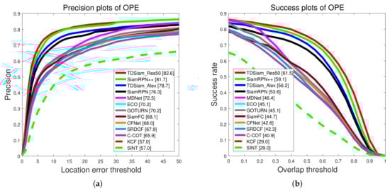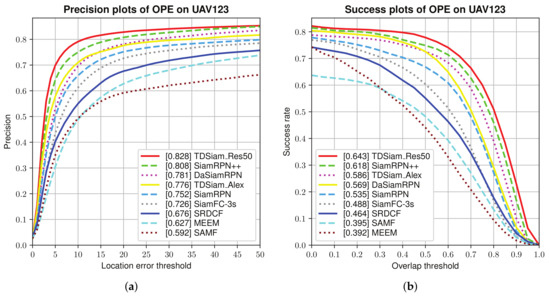 Experimental results of different methods on UAV123 dataset.The proposed algorithm TDSiam_Res50 performs favorably against other trackers. (a) Precision plots; (b) Success plots.