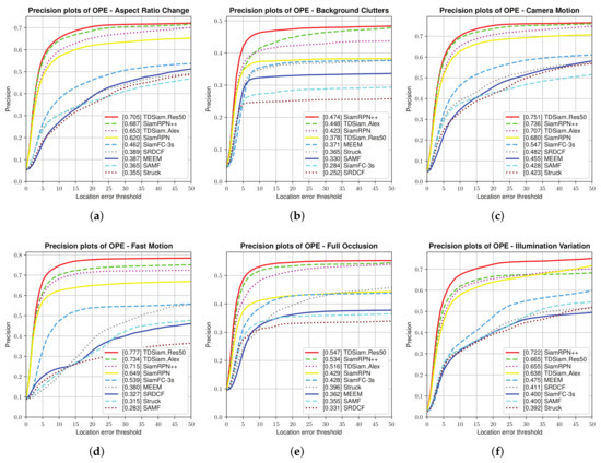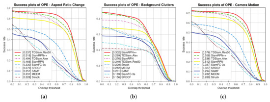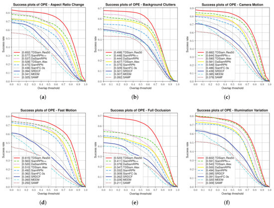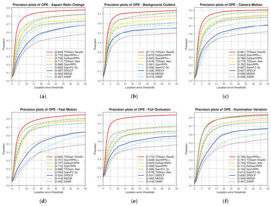 Overall Evaluation: The success plots and precision plots of the one-pass evaluation (OPE) are shown in Figure 6. TDSiam_Alex is observed to achieve a success score of 0.586 and a precision score of 0.776. Compared to the SiamRPN, TDSiam_Alex significantly outperforms in terms of the success score as well as precision score. In addition, we replaced the backbone of TDSiam with ResNet for performance comparison with SiamRPN++. The TDSiam_Res50 outperforms SiamRPN++ in terms of both metrics, TDSiam_Res50 achieves a substantial gain of 4% in terms of the success score.