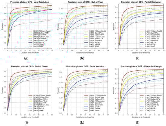Precision plots corresponding to some different scenarios. The UAV20L dataset was used for the evaluation. (a) Aspect Ratio Change; (b) Background Clutter; (c) Camera Motion; (d) Fast Motion; (e) Full Occlusion; (f) Illumination Variation; (g) Low Resolution; (h) Out of View; (i) Partial Occlusion; (j) Similar Object; (k) Scale Variation; (l) Viewpoint Change.