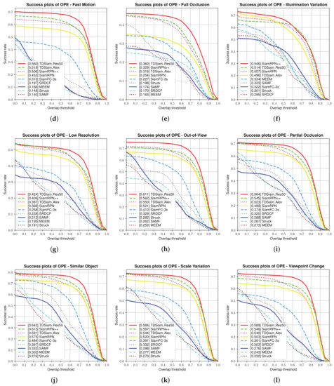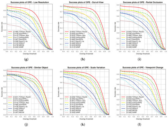 Success plots corresponding to some typical scenarios. The UAV123 dataset was used for the evaluation. (a) Aspect Ratio Change; (b) Background Clutter; (c) Camera Motion; (d) Fast Motion; (e) Full Occlusion; (f) Illumination Variation; (g) Low Resolution; (h) Out of View; (i) Partial Occlusion; (j) Similar Object; (k) Scale Variation; (l) Viewpoint Change.