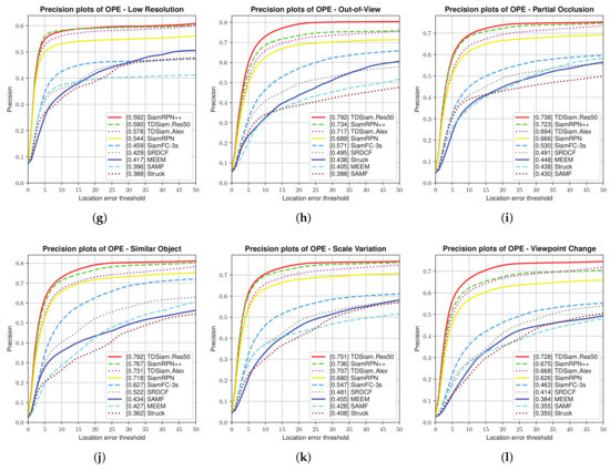 Precision plots corresponding to some typical scenarios. The UAV123 dataset was used for the evaluation. (a) Aspect Ratio Change; (b) Background Clutter; (c) Camera Motion; (d) Fast Motion; (e) Full Occlusion; (f) Illumination Variation; (g) Low Resolution; (h) Out of View; (i) Partial Occlusion; (j) Similar Object; (k) Scale Variation; (l) Viewpoint Change.