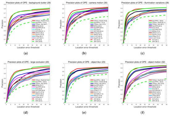 Attribute-Based Evaluation: The performance is evaluated under eight attributes and the comparison results are shown in Figure 13 and Figure 14. In terms of success rate, the TDSiam_Res50 achieved the best performance under all the attributes, which were BC (0.548), CM (0.587), IV (0.66), LO (0.521), OB (0.627), OM (0.600), SMO (0.610), SV (0.616). In particular, compared with SiamRPN++, the success rate under CM, SMO and IV was increased by 9.3%, 6.3% and 5.3%, respectively. In addition, compared with the baseline tracker SiamRPN, the TDSiam_Alex also achieved better performance under all the attributes. As for precision score, the TDSiam_Res50 achieved the best performance under six attributes, which were BC (0.750), CM (0.788), LO (0.676), OM (0.811), SMO (0.879), SV (0.808), respectively. In addition, compared with the baseline tracker SiamRPN, TDSiam_Alex achieved better performance under all the attributes.