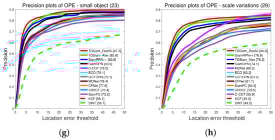 Precision plots corresponding to some different scenarios. The UAVDT dataset was used for the evaluation. (a) Background Clutter; (b) Camera Motion; (c) Illumination Variations; (d) Large Occlusion; (e) Object Blur; (f) Object Motion; (g) Small Object; (h) Scale Variations.