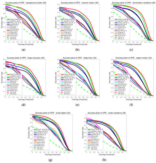 Success plots corresponding to some different scenarios. The UAVDT dataset was used for the evaluation. (a) Background Clutter; (b) Camera Motion; (c) Illumination Variations; (d) Large Occlusion; (e) Object Blur; (f) Object Motion; (g) Small Object; (h) Scale Variations.