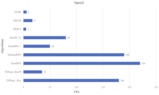 Figure 16 shows the speed performance of different methods, including SiamRPN++ [28], DaSiamRPN [23], SiamRPN [14], SiamFC-3s [12], SRDCF [17], MEEM [43] and SAMF [44]. Due to the addition of template library, the tracking speed of our proposed method decreases slightly compared with the SiamRPN++ and SiamRPN. Although our method TDSiam_Res50 is not the fastest, it can still meet the real-time requirements and reach 35 fps.