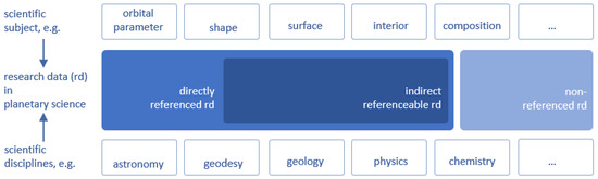 The research data developed and worked out in planetary science could be grouped into (1) directly referenced research data, i.e., the data have an inherent spatial reference in the file description (spatial data format) via the reference body and/or projection, (2) indirectly referenceable data, i.e., the dataset is related to a spatial location, or here planetary body, but this information is not included in the file description (e.g., diagrams or measurements), and (3) non-referenced data, i.e., data without any spatial relation such as laboratory data or programming code.